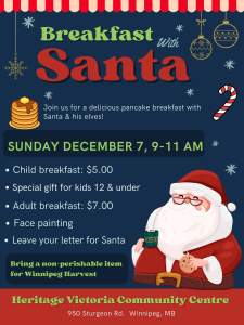 Breakfast with Santa Sunday, December 7, 2025 9:00 am – 11:00 am It is free admission to everyone. Santa will give a free gift to children aged 12 and under. Visits and pictures are free! We also will have a craft centre set-up. Pancakes, sausage and drinks will be available for purchase.
